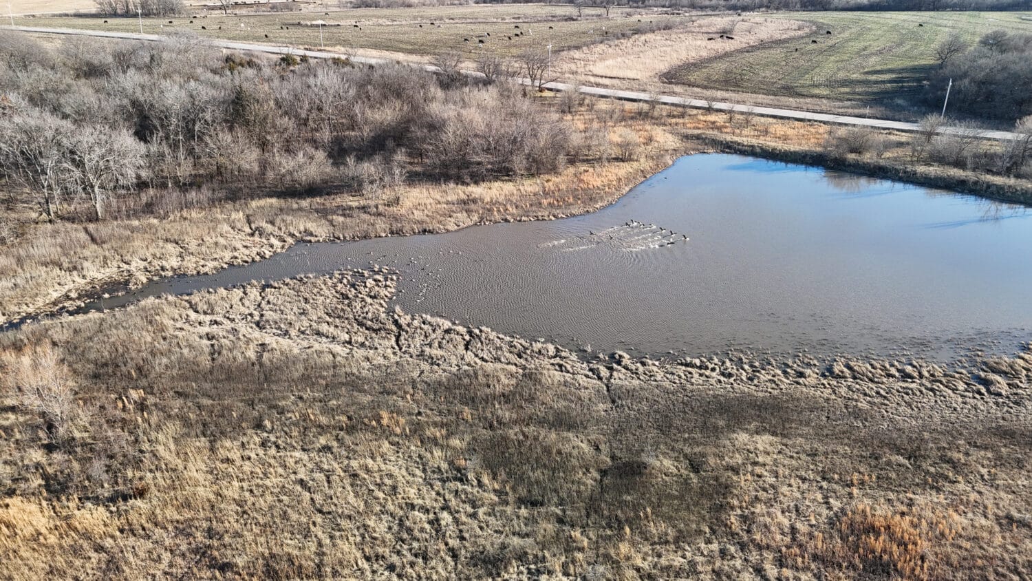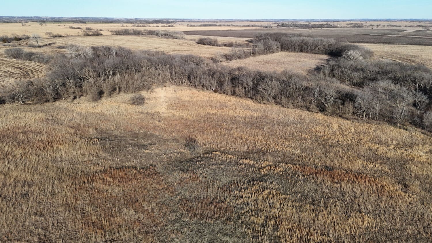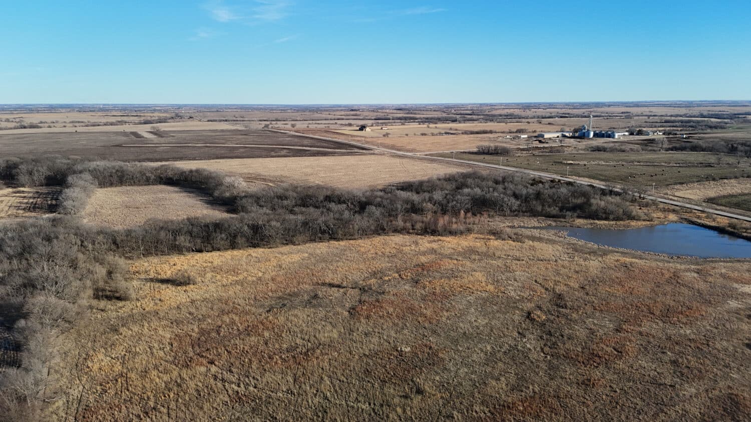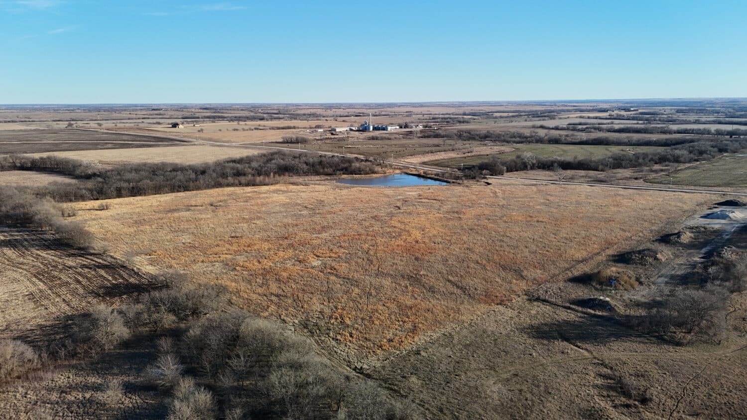 Tract 2 totals 35 acres more or less with an excellent location featuring pavement frontage along the entire south boundary. This is a property type that rarely comes to market due to its size, proximity to electric service and pavement frontage, making it a great prospect for those seeking a location to build their forever home. This tract has a quality stand of resilient Native grass pasture and a sizable pond in the southeast corner. There’s a substantial elevation change with the topography falling from west to east. The area just west of the pond would make an excellent building site with a back-deck views looking eastward over the pond and sheltered from the summer sun.