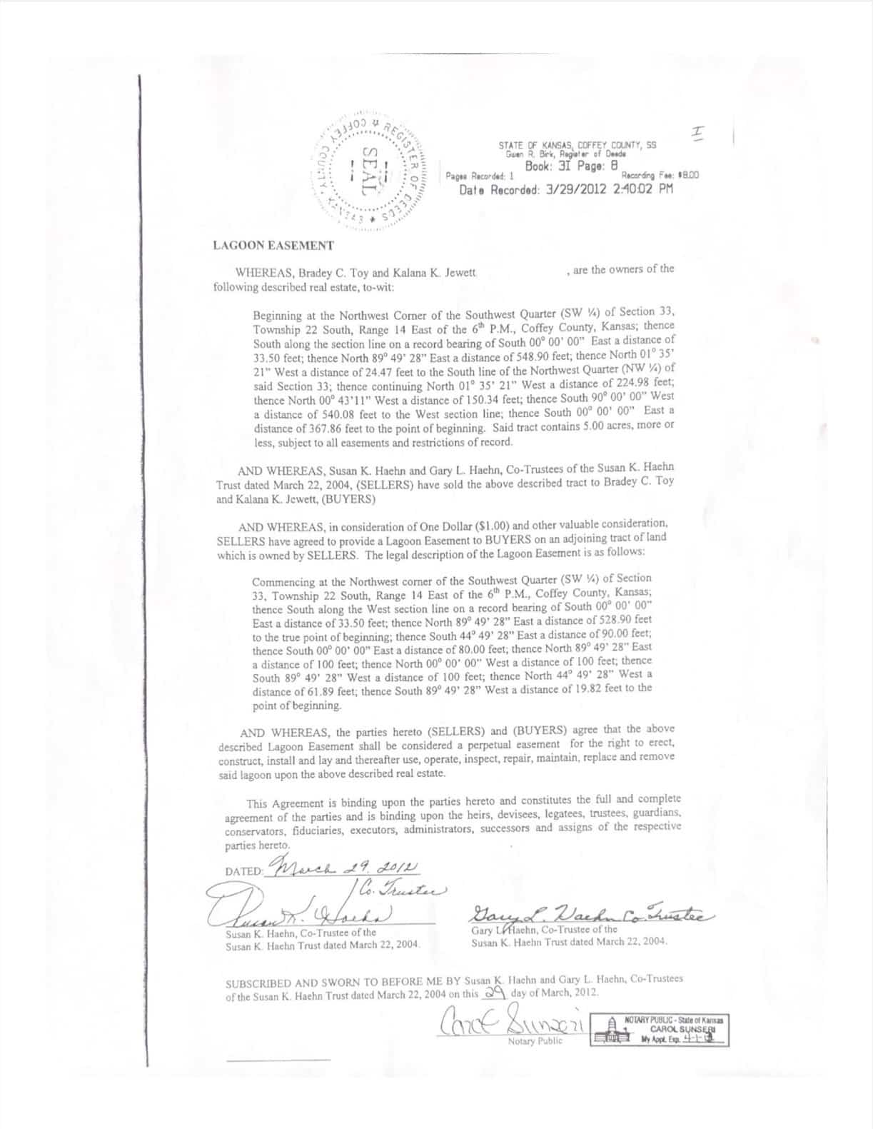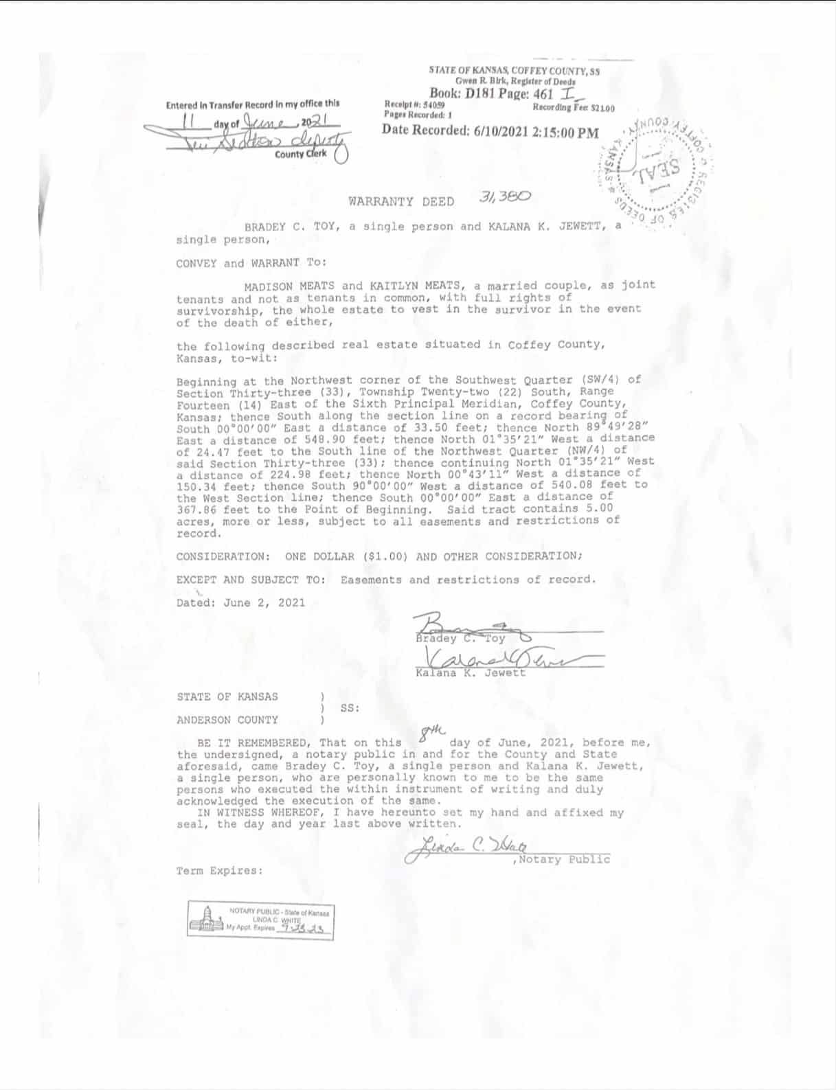 Brief Legal Description: A tract containing 5 acres, more or less, in the Northwest corner of the Southwest 1/4 in Section 33, Township 22 South, Range 14 East of the 6th P.M., Coffey County, Kansas.